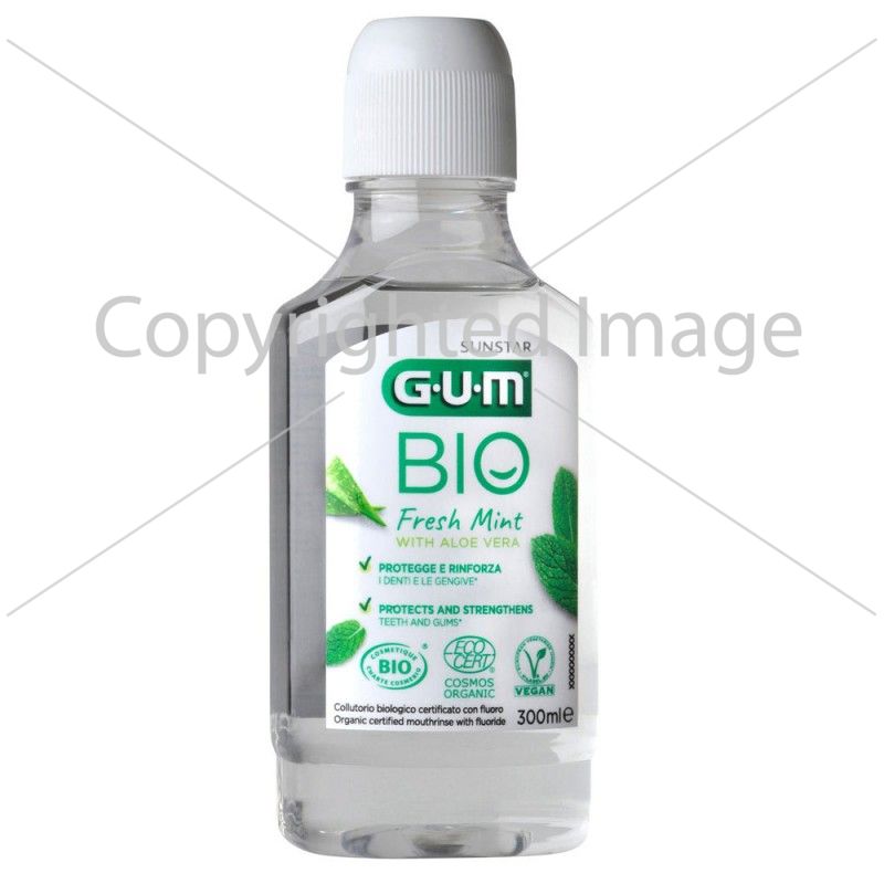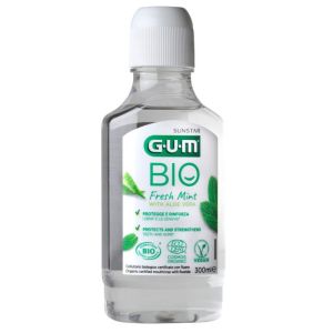 Ополіскувач для ротової порожнини GUM BIO не містить спирту і на 99% складається з натуральних інгредієнтів, підібраних за їх відповідними властивостями. Органічно сертифікована перцева м'ята виводить класичну м'ятну свіжість на новий рівень, а заспокійливе алое віра, відоме своїми антибактеріальними та протизапальними властивостями, дбає про ваші ясна.