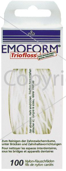 Суперфлоcc (зубна нитка) EMOFORM Triofloss розроблений безпосередньо для ретельного чищення під мостоподібними протезами та брекет-системою, а також навколо шийки зубів та імплантів.