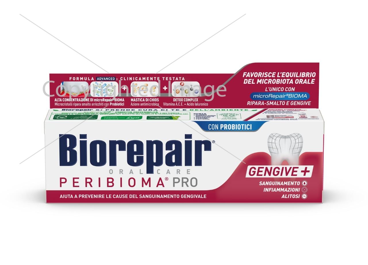 Зубна паста та жувальні гумки з microRepair®BIOMA, збагачені пробіотиками, з інноваційною дією підтримують нормальну мікробіоту порожнини рота та допомагають запобігти запаленню та кровоточивості ясен. Зубна паста Biorepair® PERIBIOMA® PRO також відновлює емаль та захищає лінію ясен від дії бактерій завдяки протимікробній дії Хіоської мастики. Формула доповнюється вітамінним комплексом з гіалуроновою кислотою, що надає дезінтоксикаційну, антиоксидантну та відновлюючу дію на тканині ясна.