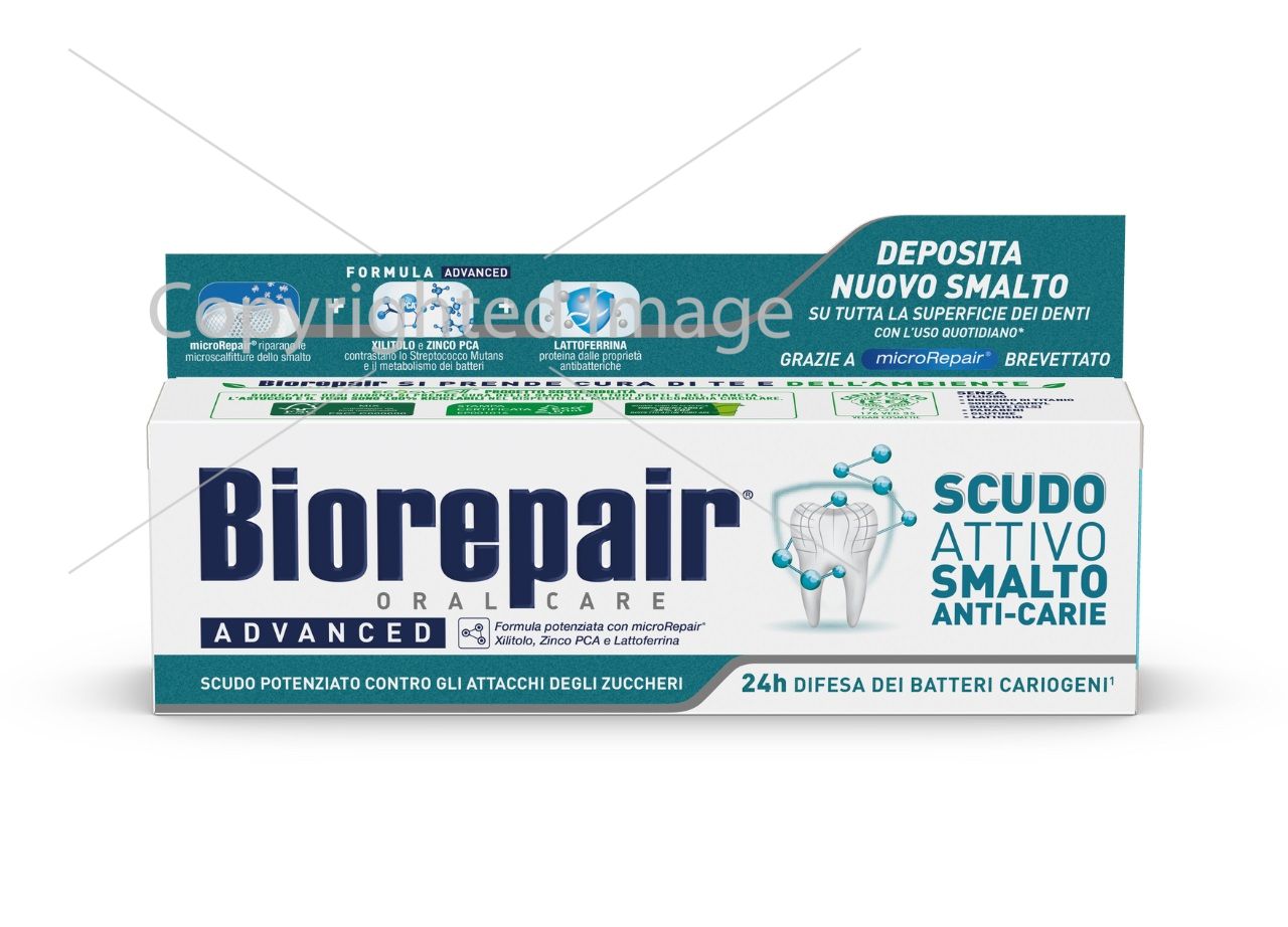 Інноваційна формула Biorepair® PRO Active Shield запобігає формуванню та розвитку патогенних бактерій завдяки комбінованій дії цинку РСА, який порушує метаболізм патогенних бактерій, та ксиліт, який знижує концентрацію патогенного мікроорганізму Steptococus Mutans, основного збудника карієсу. Комплекс microRepair® відновлює емаль, запечатує мікроподряпини емалі запобігаючи проникненню бактерій.
