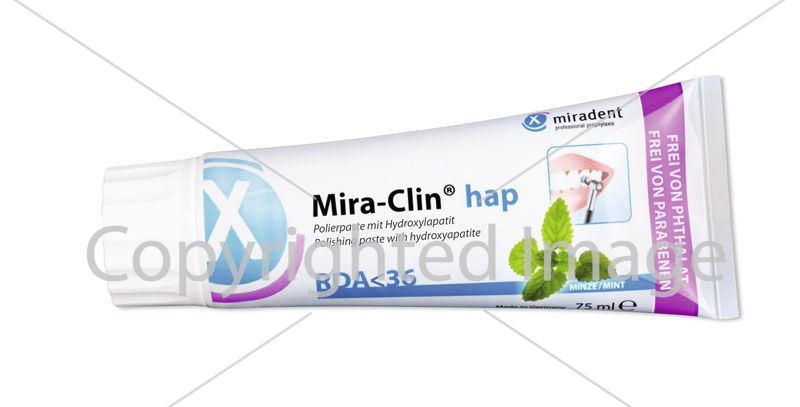Miraclin Clin Hap - це нова полірувальна паста без фторидів, що містить гідроксиапатит і сприяє лікуванню чутливих шийок зубів, ефективно видаляє зубний нальот та поверхневу пігментацію. Крім того, вона створює захисний шар на емалі та пришийкових особливостях зубів, зменшуючи гіперчутливість.
