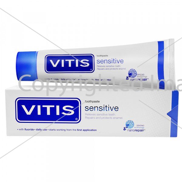 Для вашого щоденного догляду VITIS пропонує зубну пасту Sensitive , яка знімає біль, спричинений чутливістю зубів, та відновлює зуби та захищає їх від першого застосування. Ця зубна паста має подвійну дію для чутливих зубів завдяки своїй формулі: