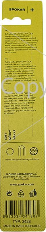 Зубна щітка Spokar Plus із прозорою закругленою ручкою та маленькою голівкою. Форма та розмір голівки щітки забезпечують доступ до важкодоступних місць ротової порожнини й ефективно видаляють зубний наліт. Головка щітки забезпечена волокнами з шестикутним профілем, що гарантує вищу щільність щітки, її триваліший термін служби та ефективніше видалення зубного нальоту.