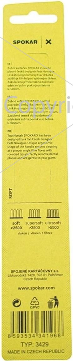 В основі конструкції зубної щітки Spokar X - особлива ергономіка ручки. Її лінії були розроблені чеським дизайнером Петром Новаго, ефективність протестована в спеціальних лабораторіях і з'явилася унікальна ручка у формі літери X - ідеальна для техніки чищення BASS.