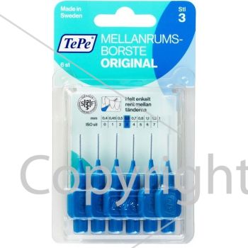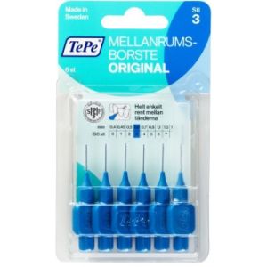 Міжзубні йоржики TePe Original випускаються в 9 розмірах з колірним кодуванням, які підходять як для вузьких, так і для широких зазорів.