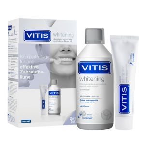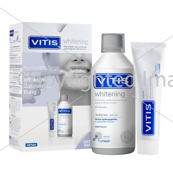 Завдяки своїй унікальній комбінованій формулі, зубна паста та ополіскувач VITIS WHITENING (ВІТІС ВАЙТЕНІН) ефективно відбілюють зуби, відновлюючи їхню натуральну білизну та яскравість. У той же час вони жодним чином не ушкоджують тканини зубів, навіть більше зміцнюють емаль і запобігають виникненню чутливості.