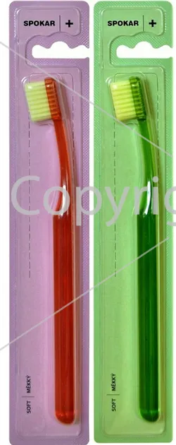 Зубна щітка Spokar Plus із прозорою закругленою ручкою та маленькою голівкою. Форма та розмір голівки щітки забезпечують доступ до важкодоступних місць ротової порожнини й ефективно видаляють зубний наліт. Головка щітки забезпечена волокнами з шестикутним профілем, що гарантує вищу щільність щітки, її триваліший термін служби та ефективніше видалення зубного нальоту.