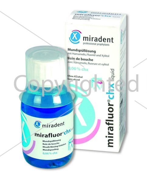 Mirafluor chx - готовий до використання розчин для полоскання, для щоденного догляду за зубами та порожниною рота (відповідна консистенції та складу). Засіб для ефективної профілактики всіх наслідків недосконалої або неефективної гігієни ротової порожнини у важкодоступних ділянках, а саме Халітоз, наліт у міжзубних проміжках, карієс пришийкових ділянках та подразнення ясен.