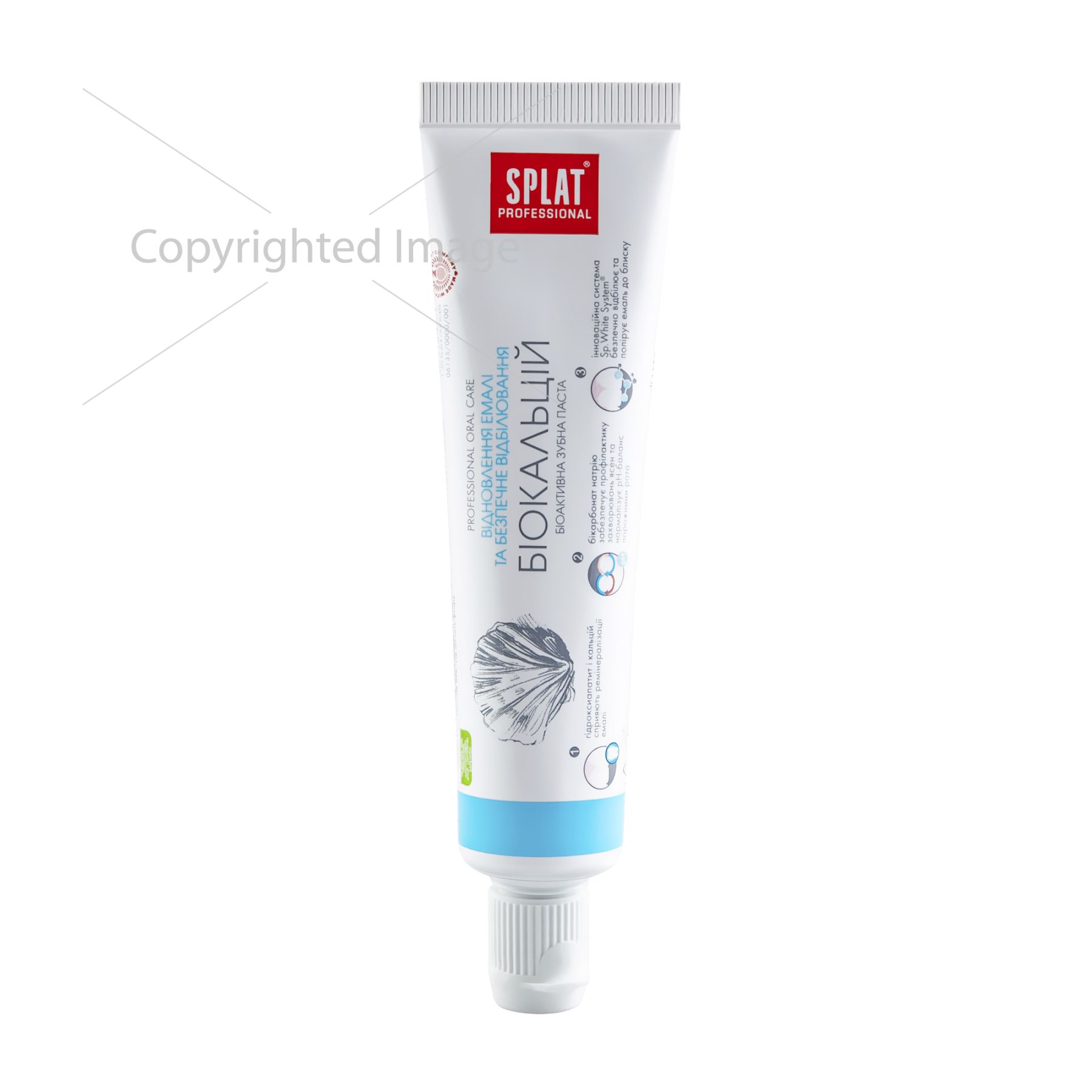 Паста приводить в норму pН порожнини рота і сприятливо впливає на ясна. Унікальна система Sp.White System® м'яко відбілює та полірує емаль до "скрипу". Фахівці компанії SPLAT рекомендують використовувати цю пасту для відновлення емалі, усунення чутливості зубів та мікротріщин. Зубна паста СПЛАТ Біокальцій ефективно запечатує дентинні канальці – ефект мікропломби.