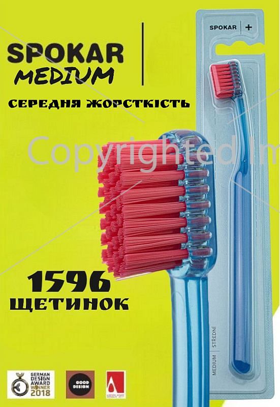 Зубна щітка Spokar Plus із прозорою закругленою ручкою та маленькою голівкою. Форма та розмір голівки щітки забезпечують доступ до важкодоступних місць ротової порожнини й ефективно видаляють зубний наліт.