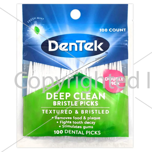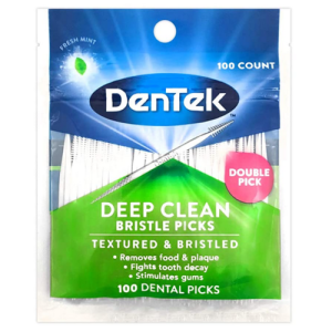 Dentek поєднав ці два види зубочисток! Гнучкі щетинки викидають залишки їжі з міжзубних проміжків, а текстурована поверхня зубочистки прибирає все інше.